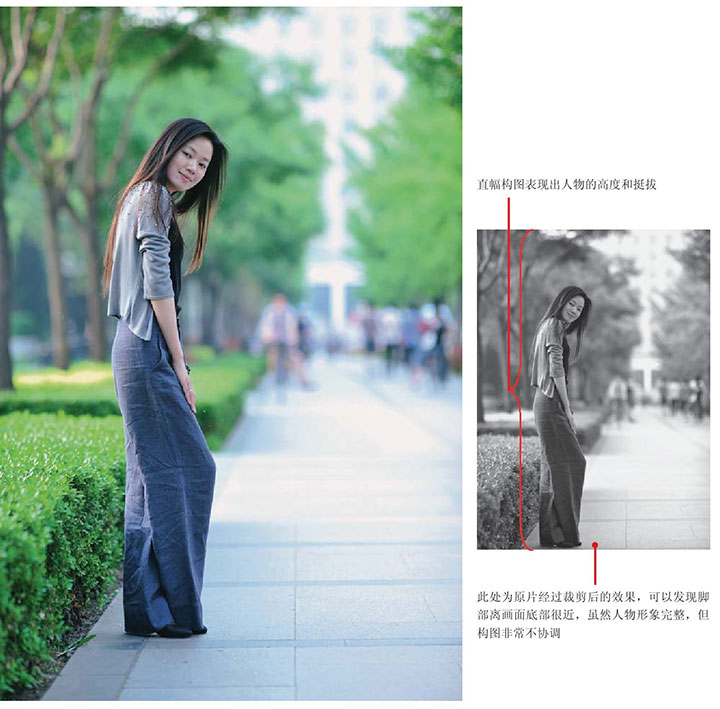 在人像写真方面,人站立时要拍摄比较清晰、比较完整的画面,多需要使用直幅构图。使用直幅方式拍摄人像,通常也是为表现一种高大、挺拔的形象。构图时要注意,在人物的立足点周围,要留下充分的空间,并且不宜太靠近照片画面的底部,否则会使照片显得拥挤,或破坏构图的协调感。
