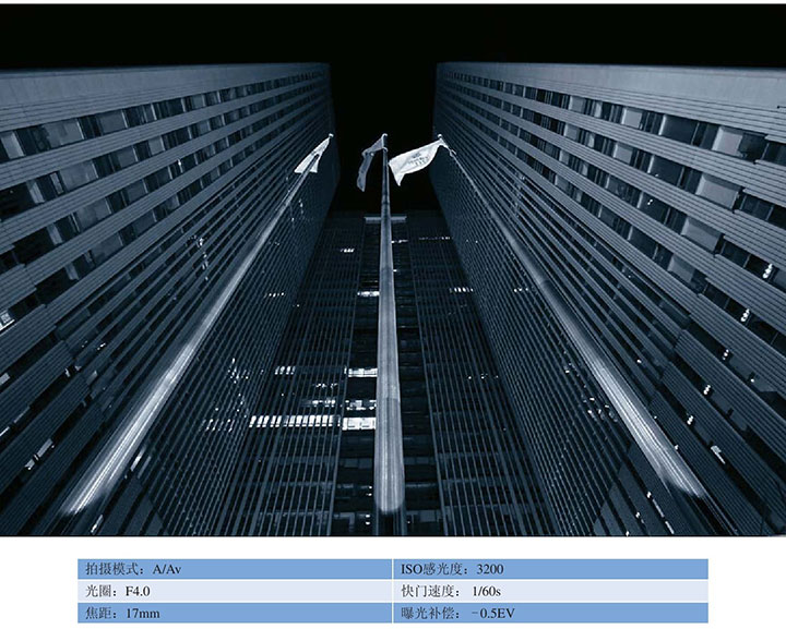 ● 夜晚拍摄,光线较弱,需要设定较高的ISO感光度才能获得足够的快门速度。