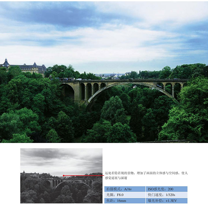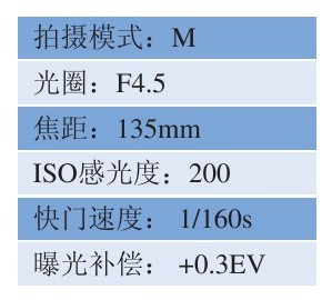 ● 因为拍摄画面亮度不高,光圈不够大,并且使用了较低的ISO感光度,所以为防止画面曝光不足,增加了1.3挡的曝光补偿。