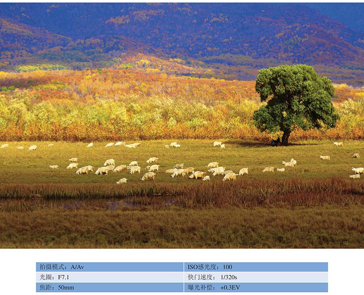 ● 在满是秋色的环境中,以散落的羊群为主体,以单独的一棵树木作为陪衬,这样画面不会显得单调。
