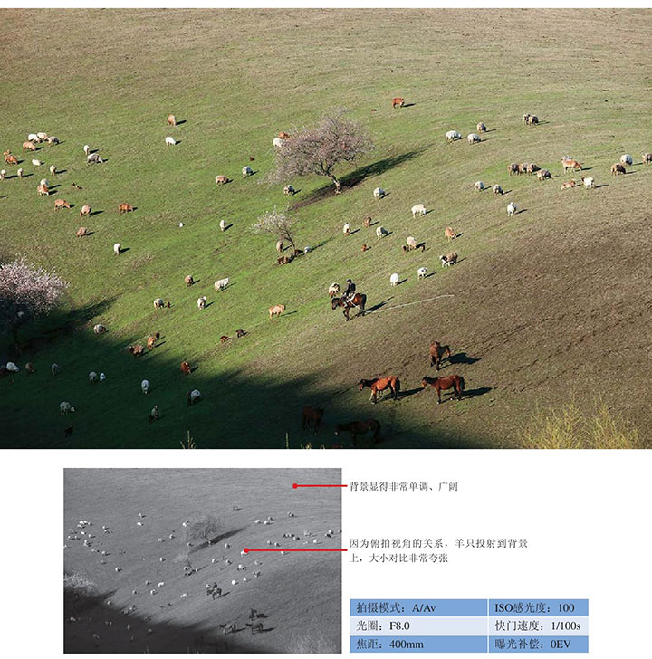 ● 因为距离较远,采用俯拍的方式拍摄,可以使较小的主体投射到广阔的背景上,产生一种夸张的大小对比。