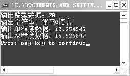 实例代码中,使用不同的格式化字符串控制不同类型的变量输出值。程序运行后的结果如图2.1所示。如果将代码段“printf("输出字符串:%s\n",name);”修改为“printf("输出字符数据:%c\n",name);”,则程序运行后,只会输出字符数组name中的第一个字符数据,如图2.2所示。
