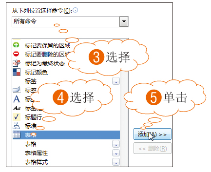 1 单击快速访问工具栏右侧的下三角按钮,2 从展开的下拉列表中选择要添加到快速访问工具栏中的操作,例如选择“快速打印”操作,如图1-6所示。若需添加更多的命令,可单击“其他命令”选项,弹出“Excel选项”对话框,并自动切换到“快速访问工具栏”选项卡下,3 在“从下列位置选择命令”下拉列表中选择“所有命令”,4 再在其下方的列表框中选择要添加的操作,例如选择“表格”选项,5 单击“添加”按钮,如图1-7所示。单击“确定”按钮,返回工作簿中,此时可以看到快速访问工具栏中新增了两个按钮,即“快速打印”和“表格”操作按钮,如图1-8所示。