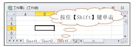 选择相邻的工作表:选择第一张工作表后按住【Shift】键,再单击要选择的最后一个工作表标签,即可选择相邻的工作表,如图1-10所示。