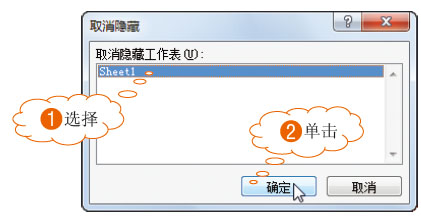 04 选择取消隐藏的工作表。弹出“取消隐藏”对话框,1 在“取消隐藏工作表”列表框中选择要取消隐藏的工作表,例如选择Sheet1,2 再单击“确定”按钮,即可将Sheet1工作表重新显示出来,如图1-32所示。