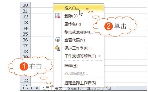 01 单击“插入”命令。1 右击工作表标签,例如右击“1月工资表”标签,2 从弹出的快捷菜单中单击“插入”命令,如图1-13所示。