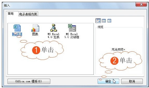 02 选择插入对象。弹出“插入”对话框,1 在“常用”选项卡下单击“工作表”图标,如图1-14所示。2 选定后单击“确定”按钮。