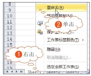 01 单击“重命名”命令。1 右击Sheet1工作表标签,2 从弹出的快捷菜单中单击“重命名”命令,如图1-26所示。