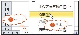 01 隐藏工作表。1 右击需隐藏的工作表标签,2 从弹出的快捷菜单中单击“隐藏”命令,如图1-29所示。