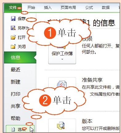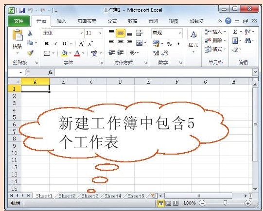 1 单击“文件”按钮,2 从弹出的菜单中单击“选项”按钮,如图1-33所示。弹出“Excel选项”对话框,3 在“常规”选项卡下“新建工作簿时”选项组中的“包含的工作表数”文本框中输入新建工作簿时包含的工作表数目,例如输入“5”,如图1-34所示。单击“确定”按钮,返回工作簿中,新建“工作簿2”,可以看到在工作簿2中包含了5个默认的工作表,如图1-35所示。