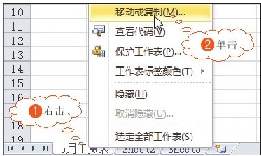 01 单击“移动或复制”命令。1 右击需要移动或复制到其他工作簿的工作表标签,例如右击“5月工资表”标签,2 从弹出的快捷菜单中单击“移动或复制”命令,如图1-22所示。
