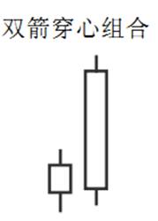 股票经过长期的下跌、横盘整理后,开始缓慢向上爬升,随着成交量的温和放大,第一日一根小阳线,第二日一根放量的大阳K线同时上穿11日、21日、34日均价线,形成多头的上攻态势,称这种形态为双箭穿心。双箭穿心出现后,一般新的涨势开始,是一个最佳买点(见图2-4中A、C两点)。