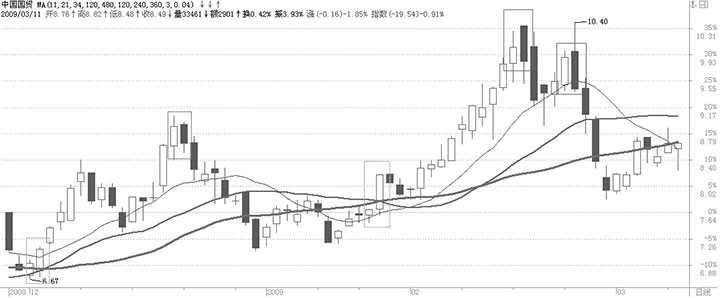 (6)K线组合必须配合成交量来看。成交量代表的是力量的消耗,是多空双方博弈的激烈程度,而K线是博弈的结果。只看K线组合,不看成交量,其效果要减半。这部分内容在第3章中再介绍。