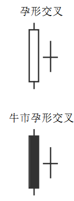 当孕形图中的第二个图形星是十字星时便形成了孕形交叉,如左图所示形态。与其他孕形图一样,孕形交叉也意味着动量的减少。然而,十字星也表示不确定状态。