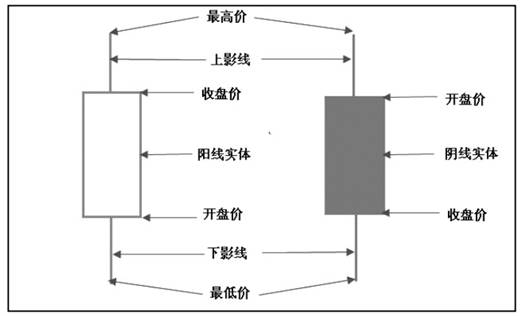 K线又被称为蜡烛图,据说起源于18世纪日本的米市,当时日本的米商用来表示米价的变动,后被引用到证券市场,成为股票技术分析的一种理论。K线是一条柱状的线条,由影线和实体组成。影线在实体上方的部分叫上影线,下方的部分叫下影线。一般讲上影线长,表示阻力大,下影线长表示支撑强烈,实体分阳线和阴线(见图2-1)。当收盘价大于开盘价时就是阳K线,表示市场上涨。而开盘价大于收盘价就是阴K线,表示市场下跌。