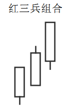 三连阳俗称红三兵,是最常见的K线组合。由3根连续创新高的小阳线组成。它的出现预示着后势上涨的概率比较大。如果是在波段的低点和趋势中途出现红三兵,表示股价会加速上涨;如果是在波段高位和趋势上轨或形态的头部区域出现红三兵,一般代表多头力量已经耗尽,后市将会调整回落(见图2-3中C区域)。