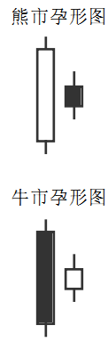 一个小白实体被包含在一个不同寻常的大黑实体之内,如左边牛市孕形图所示。当该图形出现在下降趋势中表示熊市动量的减少。