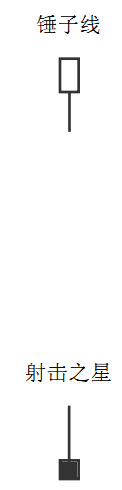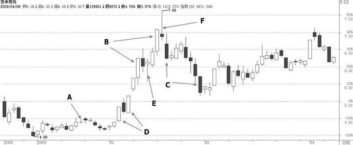 射击之星是一根上影线很长的线形,实体很小而位于交易区间的下端,实体是阳是阴无关紧要。当行情已上升到一定阶段后经常会出现,它表示市场已经失去持续的上升动力,随时有可能见顶回落(见图2-2中F点)。