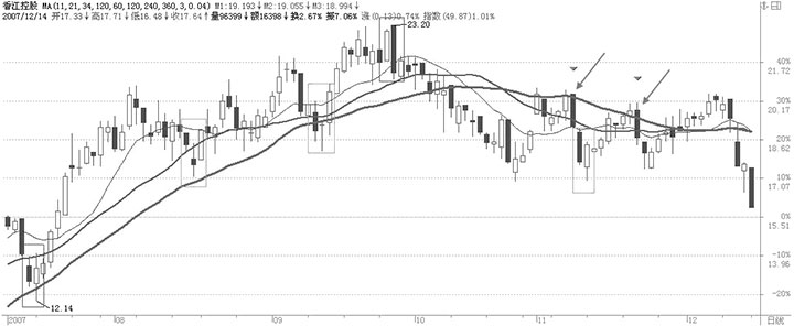 断头铡刀正好与双箭穿心相反,是指股价在高位盘整时,出现一根长阴线(有时两根)快速跌穿三根平均线,此时如果长期平均线趋势已经向下(斜率为负),那么说明主力出货,形成逃顶信号。如图2-5中A、B两点都一根大阴线下跌,而且K线实体一口吞掉11日、21日、34日均线,为何这个组合形态叫做“断头铡刀”!因为这种K线组合形态是市场陷入恐慌性出逃的标志。当有大的利空出现时往往会有这种图形出现,是后市强烈看空的信号。一般而言断头铡刀K线组合形态出现后,该股随后可能绵绵下跌,尽管途中有小反弹出现,但跌势已定,无可挽回,因为主力已经铁心出局了。