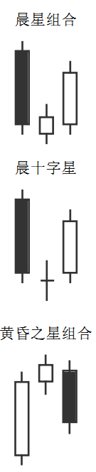 黄昏之星和晨星组合(也叫早晨之星)恰好相反,左边对应的黄昏之星组合它通常出现在股价连续大幅上涨以后或中期顶部和大顶,是一个头部信号。