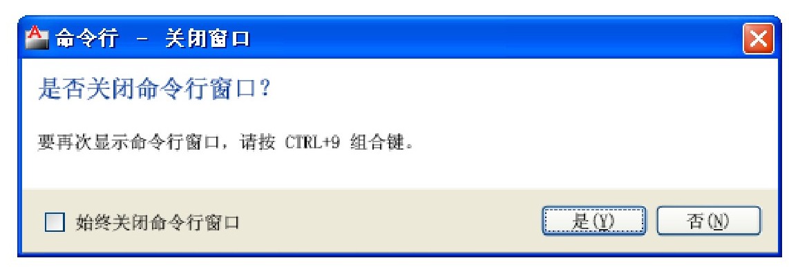 用户可以控制命令窗口的显示或隐藏,隐藏命令窗口后绘图区域将会比较宽阔。熟练掌握软件的用户可以隐藏命令窗口,打开动态输入,在操作的时候通过动态输入来输入命令或数据。命令窗口的隐藏可以通过在键盘按下【Ctrl+9】组合键来隐藏,再次按下该组合键将显示命令窗口。在隐藏命令窗口的时候程序将会弹出提示,单击“是”按钮确认关闭命令窗口,如图2-15所示。