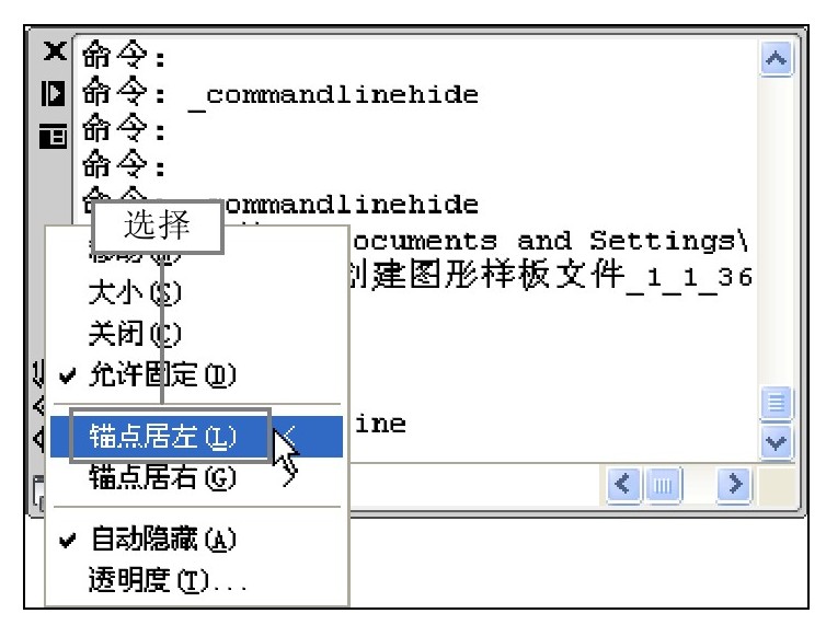 用户可以将命令窗口锚定在AutoCAD 2011窗口的左边或右边。要锚定命令窗口,命令窗口必须是浮动的,在标题栏上单击鼠标右键并选择“锚点居左”,如图2-16所示。命令窗口将处于最小化状态,移动鼠标到锚定的命令窗口上将会显示命令窗口,如图2-17所示。
