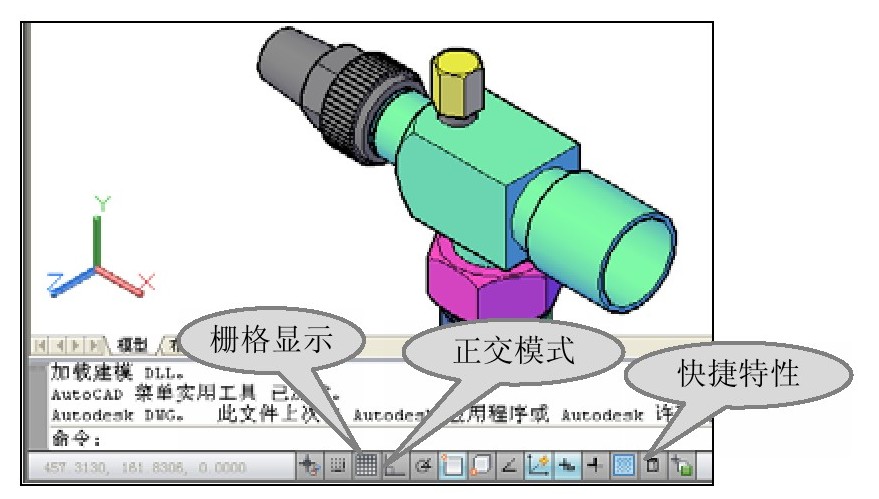 AutoCAD 2011新增加了三维对象捕捉功能。三维对象捕捉功能在三维模型中有效,三维对象捕捉能够捕捉到三维模型的三维顶点、三维端点、三维中心点。在状态栏中按下“三维对象捕捉”按钮
