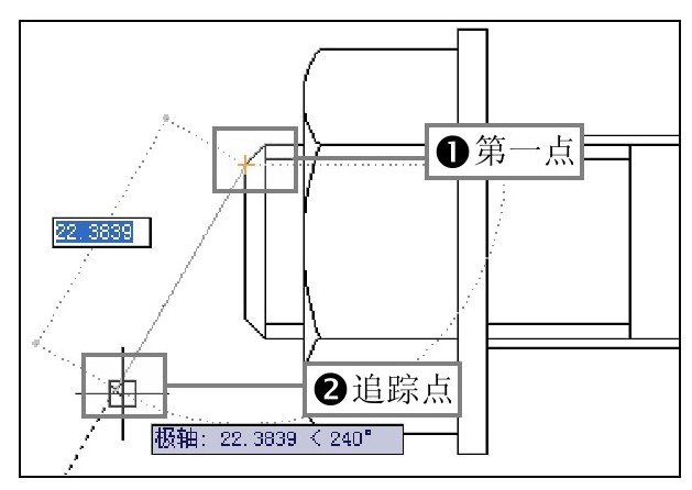 ,然后绘制图形,①指定第一点,②移动光标指定追踪点,程序自动进行极轴追踪,如图2-28所示。