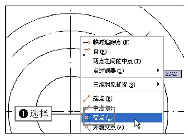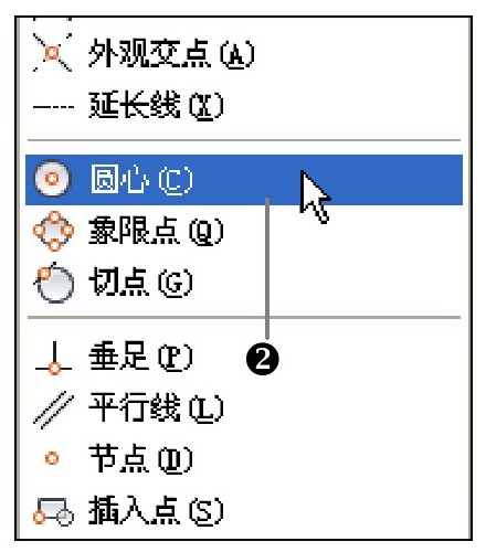 要准确捕捉点就需要限制捕捉类型,在键盘按住【Ctrl】键右击鼠标,①在弹出来的快捷菜单中用户可以选择捕捉类型,如图2-31所示。②选择捕捉类型后在绘图窗口中选择对象,程序将自动限制捕捉类型,如图2-32所示。