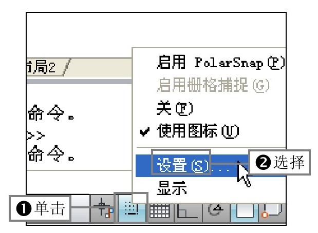 启用捕捉模式,②在“捕捉模式”按钮上右击鼠标选择“设置”命令,如图2-22所示,③在弹出来的“草图设置”对话框中的“捕捉和栅格”选项中输入X轴间距和Y轴间距,然后单击“确定”按钮启用栅格,如图2-23所示。