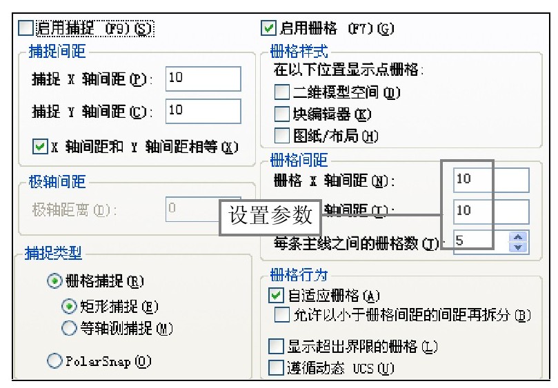 捕捉模式是按指定的间距进行移动,移动的距离取决于X轴间距和Y轴间距。①在状态栏中单击“捕捉模式”按钮