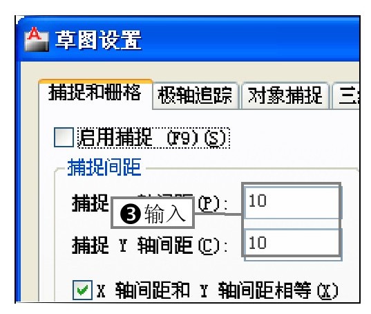 设置的轴间距越小,捕捉就越准确。轴间距值较大时,可以将图形放大来查看捕捉的点位置。用户还可以设置X轴间距与Y轴间距不相等。