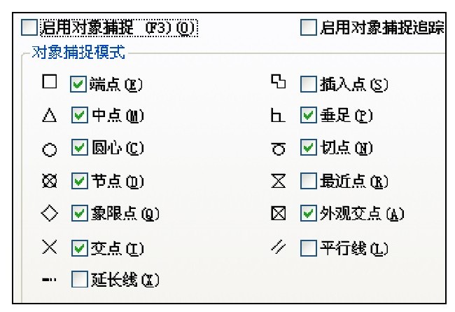 ,使用绘图工具绘制图形,选择对象后程序会根据所选对象来判断点的类型,如图2-29所示。在键盘按住【Ctrl】键右击鼠标,在弹出来的快捷菜单中执行“对象捕捉设置”命令,在“草图设置”对话框中用户可以勾选对象捕捉模式,如图2-30所示。