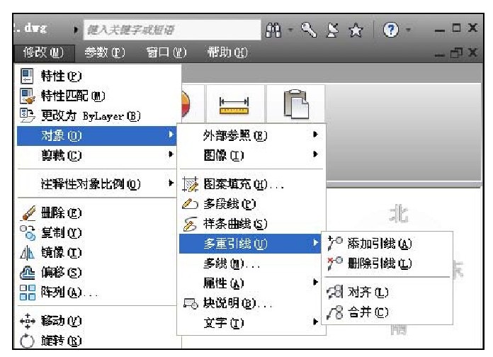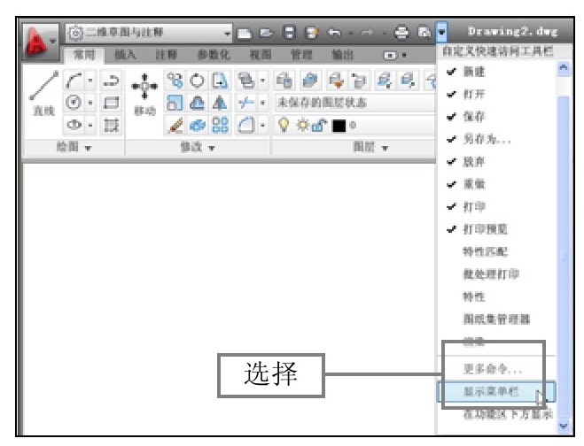菜单命令在默认情况下是关闭的,用户可以在快捷菜单栏中单击右侧的下三角按钮执行“显示菜单栏”命令来打开命令菜单,如图2-58所示。在菜单栏中带有箭头符号的菜单下面还有子菜单,这种类型的菜单称为“级联菜单”,在下拉菜单中执行相应的命令即可调用该命令,如图2-59所示。