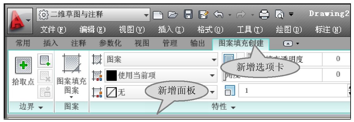 选项卡中包含了各种与选项卡内容相关的面板,用户可以在不同的选项卡之间进行切换。另外在执行某些命令时,选项卡会相应增加相关的选项卡,如图2-57所示。