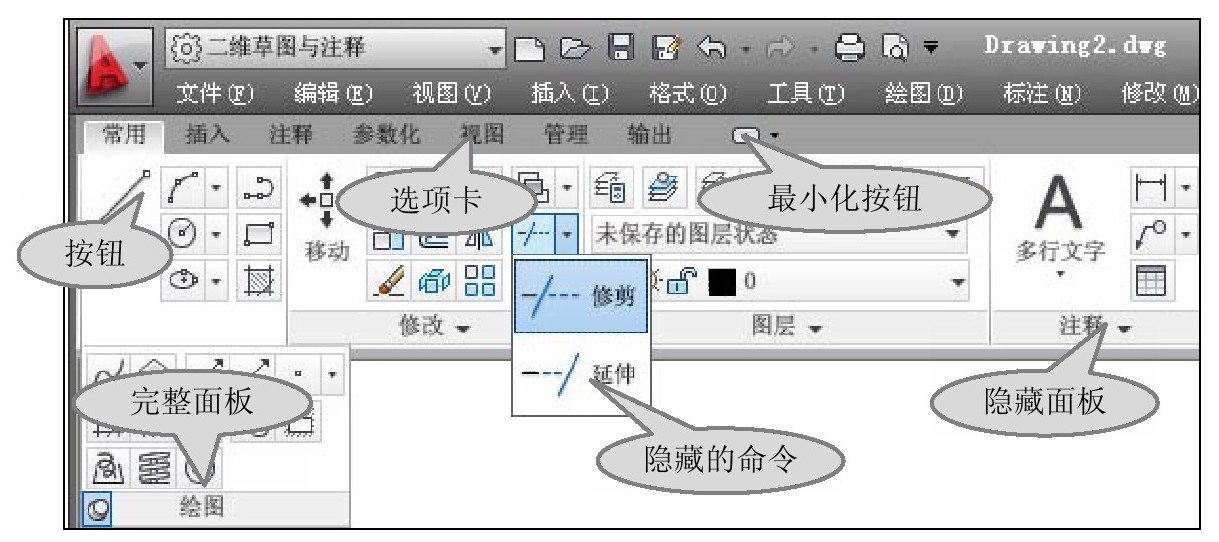 在功能区面板中单击按钮可以执行相关的命令。在按钮旁边带有三角形按钮的下面隐藏了多个命令,单击按钮旁的三角形按钮可以显示隐藏的命令。