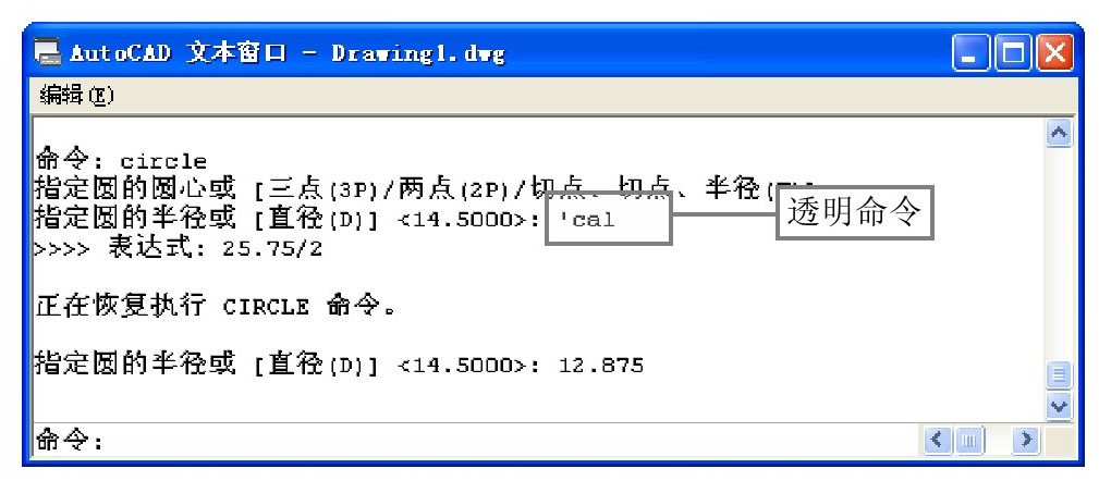 如果用户启用了“动态输入”功能,用户则可以在光标附近的工具提示中输入多个命令。许多命令可以在执行命令的同时使用,如CAL, ZOOM等,这类命令称为“透明命令”。在执行这类命令时需要在命令前添加单引号('),透明命令执行完后将恢复原命令,如图2-60所示。