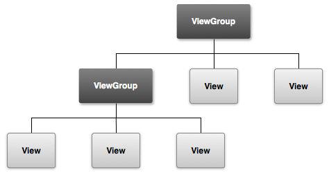 综上述,View组件是不能单独使用的,必须使用其容器组件ViewGroup包裹其它View组件。但是ViewGroup又继承于View,因此它除了可以包含普通的View组件之外,还可以再次包含ViewGroup组件。如下图所示。