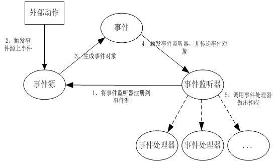 在基于监听器的事件处理模型中,主要涉及三个与之相关的对象: