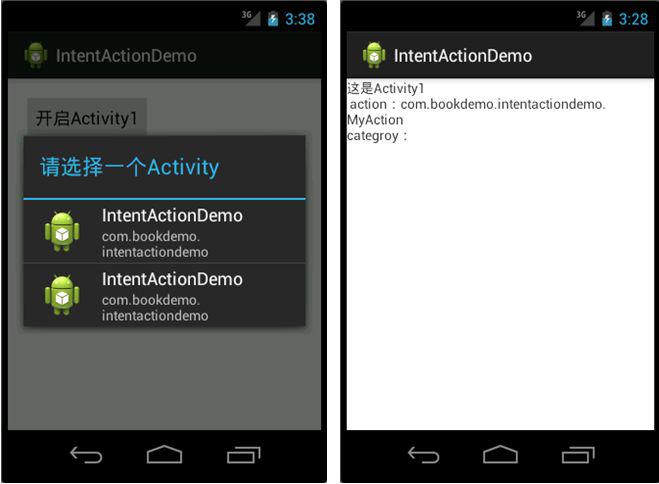 选择待开启的Activity按钮的响应事件中,仅设置了Action属性,没有设置Category属性。而通过这个Action,Android系统将会在意图过滤器中,找到两个匹配的Activity。这时,将弹出一个对话框,列出意图过滤器匹配出的符合的Activity,供用户选择。效果如下: