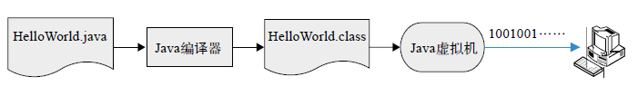 注意 图1.2中的"HelloWorld.class"也代表一个应用程序,应用程序本身就是经过打包的.class文件的集合。并且在不同的平台上安装的JVM是不同的,需要到Sun的网站下载适合自己机器操作系统平台的虚拟机。
