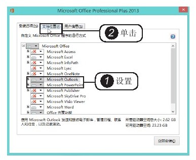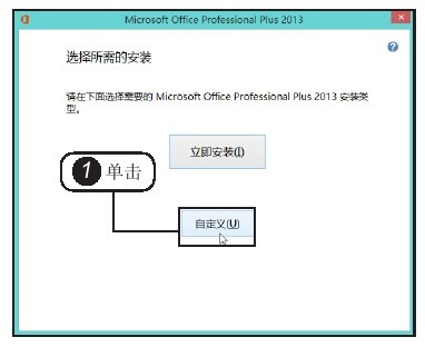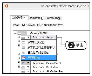 双击安装程序,弹出“选择所需的安装”界面,①单击“自定义”按钮,如图1-5所示。若要将程序安装在默认位置,并且所有程序都安装,可单击“立即安装”按钮。②从程序下拉列表中选择合适的安装选项,这里设置Microsoft Access为不可用,如图1-6所示。