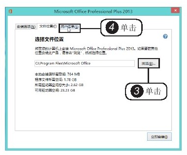 ①将Excel设置为用本机运行,设置其他的程序,完成程序的选择后,②单击“文件位置”标签,如图1-7所示。切换至“文件位置”选项卡,③单击“浏览”按钮,设置安装位置,④单击“用户信息”标签,如图1-8所示。