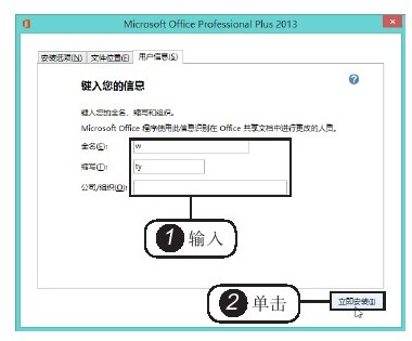切换至“用户信息”选项卡后,①输入信息,包括全名、缩写和公司/组织,②输入完毕后,单击“立即安装”按钮,如图1-9所示。随后,显示安装进度对话框,经过一段时间后,安装成功,在对话框中显示“感谢您安装Microsoft Office Professional Plus 2013”等字样,③单击“关闭”按钮,如图1-10所示。完成安装。