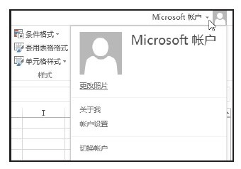 和以前版本界面相比,在Excel 2013界面右上角的窗口控制按钮下方,添加了用户账户区。单击“登录”按钮,用户可使用Microsoft账户登录Excel程序,使用户能够快速保存工作簿到云端。当用户设置Excel操作环境后,在其他电脑上使用账户登录,将看到保存的操作环境。登录后的效果如图1-19所示,单击账户下三角按钮,可执行更多相关操作。 pEvT8Sa9ZDX+PCMEDp/fuwKlEHX0vHrL1MM/9eRsJVNQ2LCyGKFOCfdKsdcwISXn