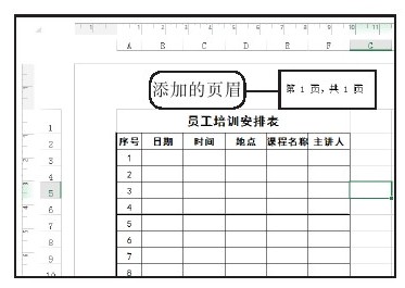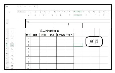 打开实例文件\第1章\原始文件\员工培训安排表.xlsx工作簿,切换至“插入”选项卡,单击“文本”组中的“页眉和页脚”按钮,如图1-23所示。切换至页面布局视图中,显示页眉,光标在页眉的中间闪烁,如图1-24所示。
