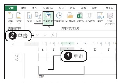 ①在要添加页脚的位置单击,②单击“页眉和页脚元素”组中的“当前日期”按钮,如图1-27所示。随后,可以看到在选择的位置插入当前日期后的效果,如图1-28所示。