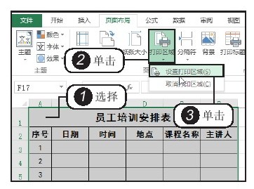 打开实例文件\第1章\原始文件\员工培训安排表1.xlsx工作簿,①选择表格所在的单元格区域,这里选择A1:F17,切换至“页面布局”选项卡,②单击“打印区域”下三角按钮,③在展开的下拉列表中单击“设置打印区域”选项,如图1-29所示。随后,在单元格区域四周显示灰色线条,如图1-30所示,表示打印区域。