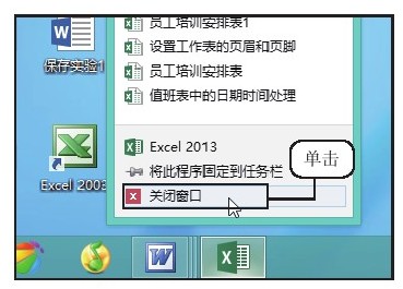 通过关闭程序退出:在Windows 8窗口下方的应用程序区,右击要关闭的Excel 2013工作簿图标,在弹出的快捷菜单中单击“关闭窗口”命令,如图1-44所示。