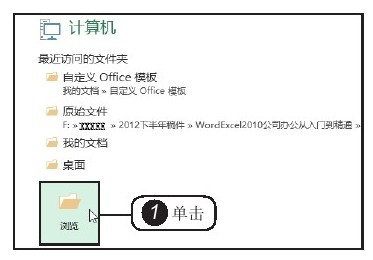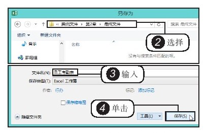 ①在右侧的“计算机”界面中单击“浏览”按钮,如图2-12所示,弹出“另存为”对话框,②在地址栏中选择当前工作簿的保存位置,③在“文件名”文本框中输入工作簿名称“员工考勤表”,④最后单击“保存”按钮,如图2-13所示。